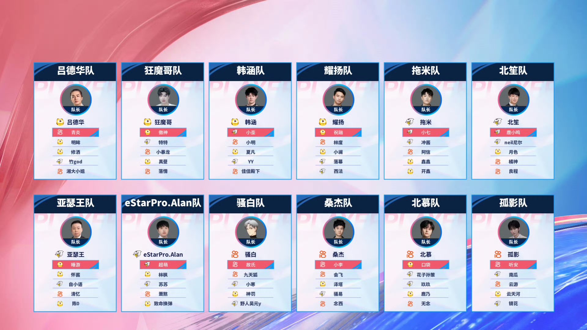 12队的队长分别是:韩涵、狂魔哥、吕德华、孤影、北慕、桑杰、骚白、eStarPro.Alan、北笙、亚瑟王、拖米、耀扬