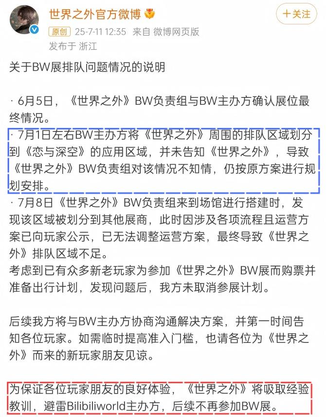 就在上周末,BW线下活动吸引了很多游戏玩家线下互动。众多游戏也都设置了自己的专属互动区。但是,就在开幕半天后,《世界之外》官方就在社交媒体发文谴责活动主办方安排不当,并直言以后不再参加BW活动,这也算是公开撕破脸。