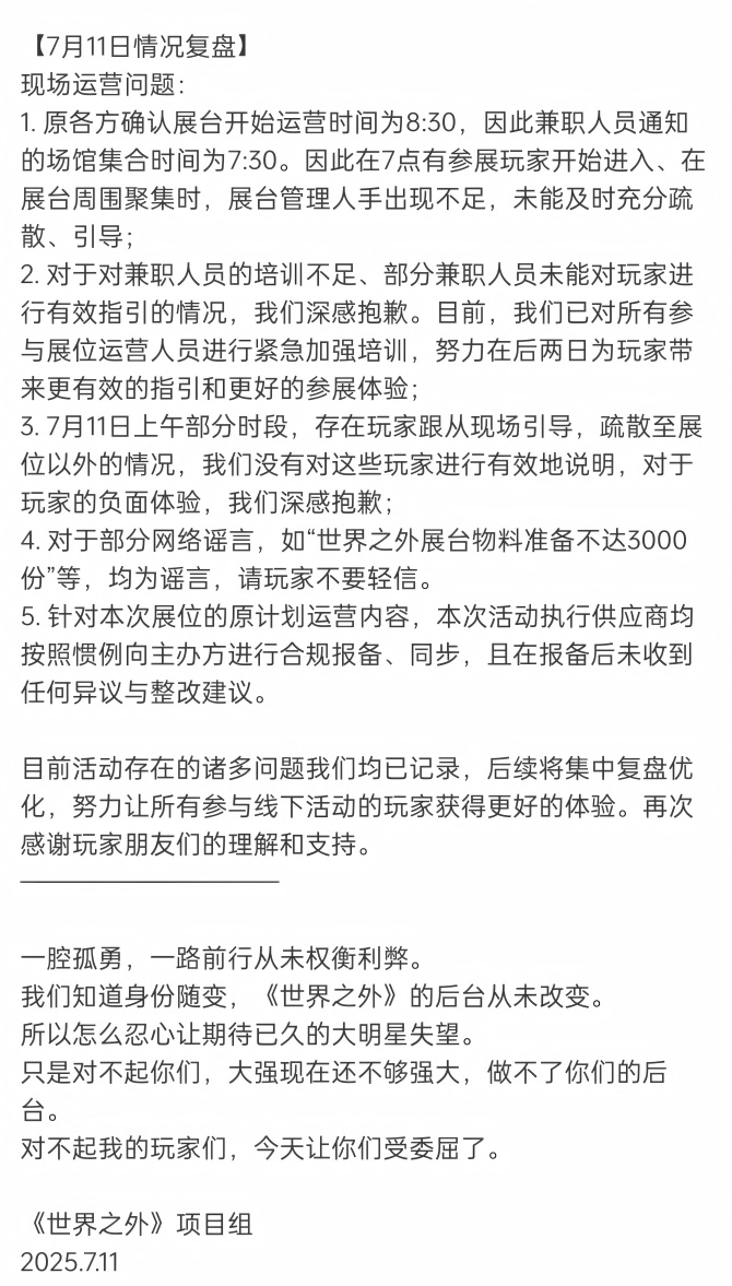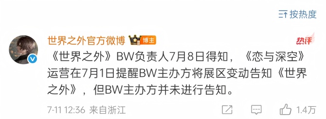这也引起了很多不明真相的网友跑去《恋与深空》的官号评论区进行谩骂指责,但是后续《世界之外》官方在评论区置顶说明了情况。《恋与深空》运营已经提前告知BW主办方将活动展区变动的情况,由于主办方未提前告知《世界之外》主办方才导致本次时间的发酵。《世界之外》官方也放出本次事件的全程。