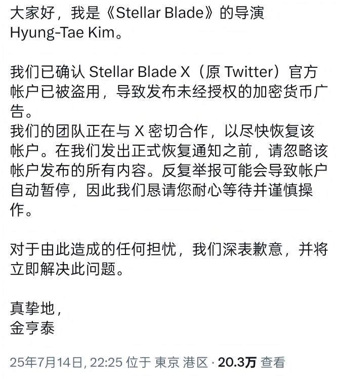 7月14日晚,Shift Up公司CEO兼《剑星》总监金亨泰证实,游戏官方社交媒体账号遭黑客入侵。他提醒玩家在官方确认账号恢复前,切勿轻信该账号发布的任何信息。