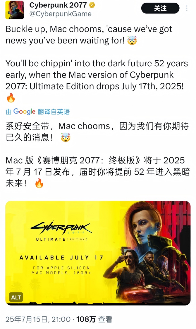 赛博朋克官方日前在社交媒体宣布《赛博朋克 2077》终极版将于7月17日登录macOS系统,为Apple Silicon芯片设备带来完整体验。虽然目前定价尚未确定,但根据其在其他平台的定价来看,预计售价在80美元左右。