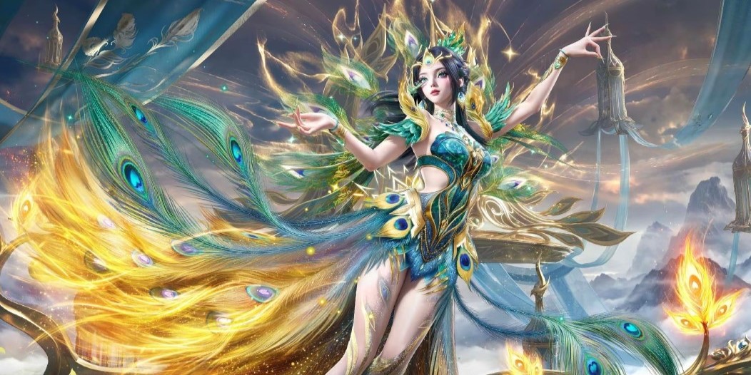创新设计:首个伴飞共舞飞行器,玩家可空中共舞;孔雀元素贯穿头饰、羽粉裙摆及开屏背饰,至臻外观由宋茜演绎,双生降临形态由杨丽萍舞团编导。